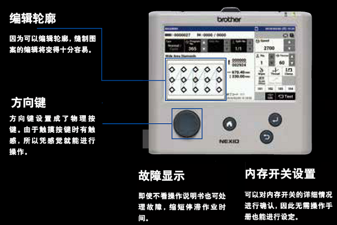 搭载7英寸大屏幕,通过触摸式液晶面板强化了编辑功能。插图多,层级少,可以直观操作。 因为轮廓可编辑,缝制图案的编辑变得十分容易。 方向键设置成了物理按键。因为触摸按键时有触感,所以凭感觉就能进行操作。