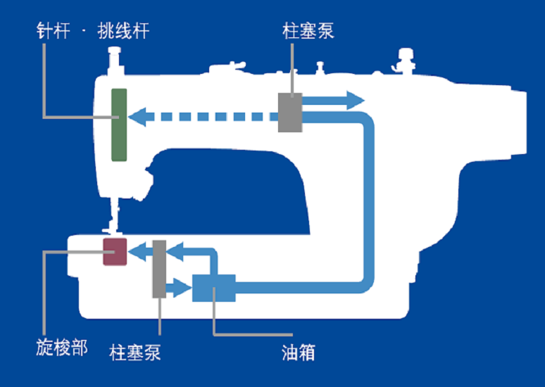 油污的90%以上来自向针杆供油,本产品将向针杆供油的方式变为微量供油。不仅能控制对针杆及挑线杆的供油,同时防止油渍飞溅,从而避免污染重要缝制物品,实现清洁缝纫。
