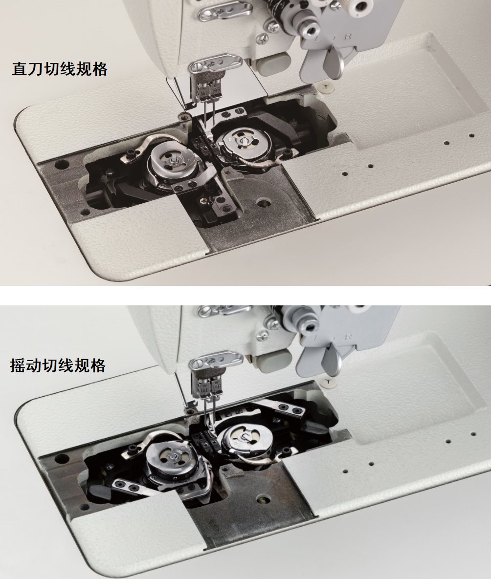 在受到好评的摇动切线规格的基础上,新增加了直刀切线规格。直刀切线机构的定刀被安装在梭床上,在更换针位时方便切线的调整。刀压的调整也更方便,在使用粗线时效果尤为突出。 *根据机种的不同,会有不能选择切线规格的情况。 *仅限T-8422D-S07、T-8452D-S07、T-8722D-S07、T-8752D-S07规格