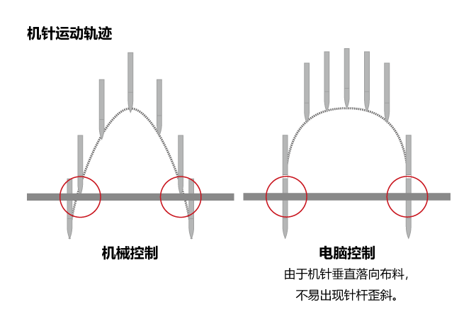 针杆装置采用带伺服控制的脉冲马达,机针向面料做垂直运动,即使高速缝纫时也不会出现跳针和错位。比机械模式下制作的花样精度更高,有助于提高缝制质量。