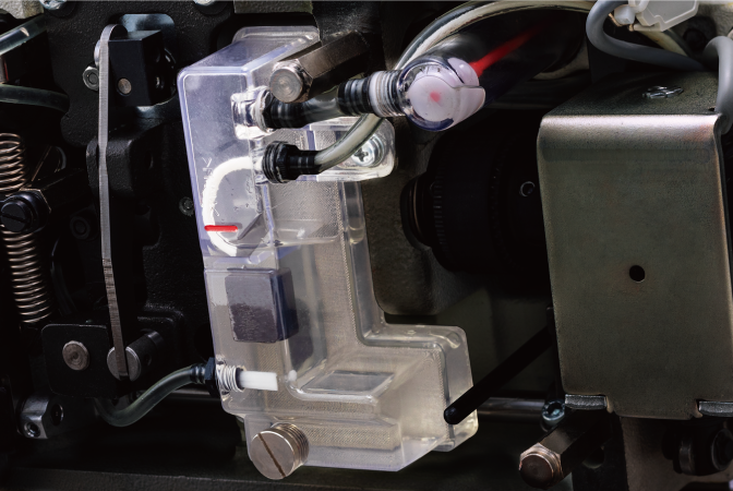 使用密闭式油箱。只对旋梭供给机油,针杆?挑线装置周围采用无油技术,防止漏油,溅油等供油产生的问题。