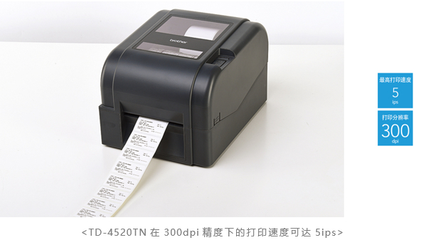 作为一款桌面型标签打印机,Brother TD-4420TN/4520TN在前代原有的热敏打印模式之上,还新增了“热转印”打印模式,标签保存时间更持久;搭配外置卷纸架还可打印更多不同尺寸的标签,以及更丰富的标签材质。使用“热转印”打印方式下,TD-4420TN打印速度可达6ips(即152.4mm/s);TD-4520TN打印速度可达5ips(即127mm/s,在300dpi下);同时其中碳带长达300m,为用户提供持续的标签打印体验。
