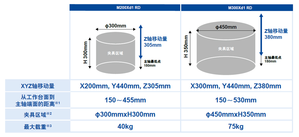保障了大范围的夹具区域,为夹具设计提供了更大的灵活性,从而满足了各种工件加工的需求。尤其是M300Xd1 RD,在夹具回转直径扩大到 φ450的同时Z轴移动量扩大到380mm,延长了从工作台面到主轴端面的距离。由此,确保了Z轴方向的大加工区域,并提高了刀具接近性。