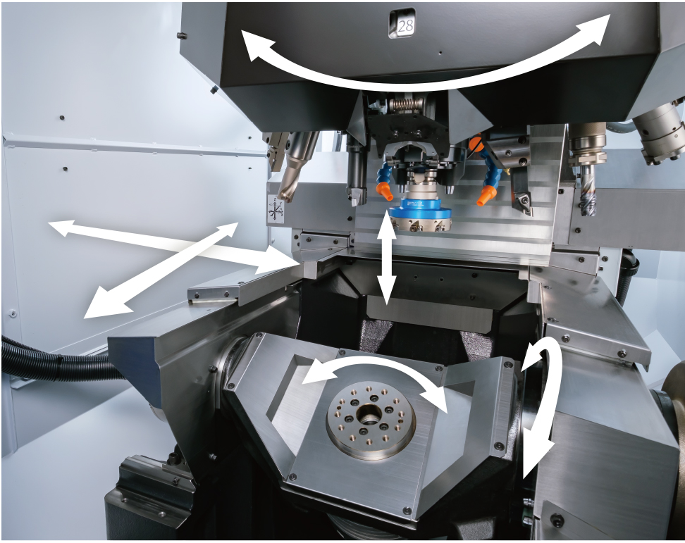 通过采用大功率马达的铣削主轴和车削主轴、以及具备高夹紧力的倾斜转台, 在复合加工及多面加工方面发挥出色的加工能力。